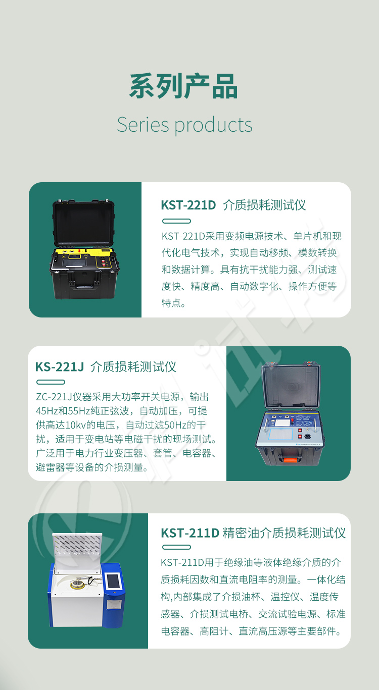 KST-221全自动抗干扰介质损耗测试仪是发电厂、变电站等现场全自动测量各种高压电力设备介损正切值及电容量的高精度仪器。由于采用了变频技术能保证在强电场干扰下准确测量。仪器采用中文菜单操作,微机自动完成全过程的测量。