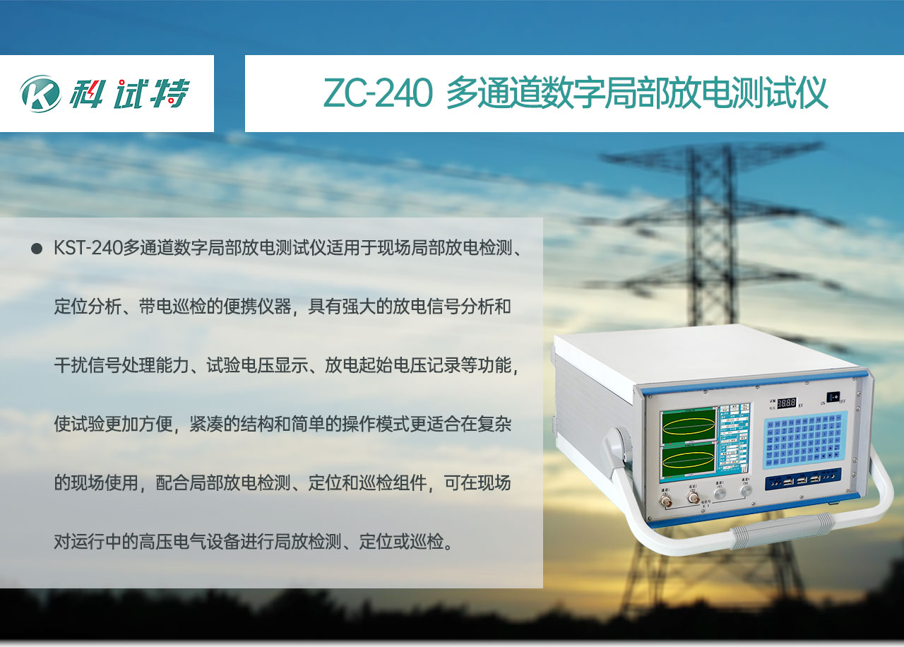 KST-240多通道数字局部放电测试仪适用于现场局部放电检测、定位分析、带电巡检的便携仪器,具有强大的放电信号分析和干扰信号处理能力、试验电压显示、放电起始电压记录等功能,使试验更加方便,紧凑的结构和简单的操作模式更适合在复杂的现场使用,配合局部放电检测、定位和巡检组件,可在现场对运行中的高压电气设备进行局放检测、定位或巡检。