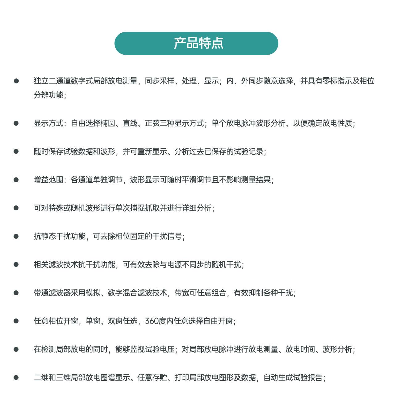 10. 单个放电脉冲波形分析、确定放电性质,可对特殊或随机波形进行单次捕捉抓取并进行详细分析。