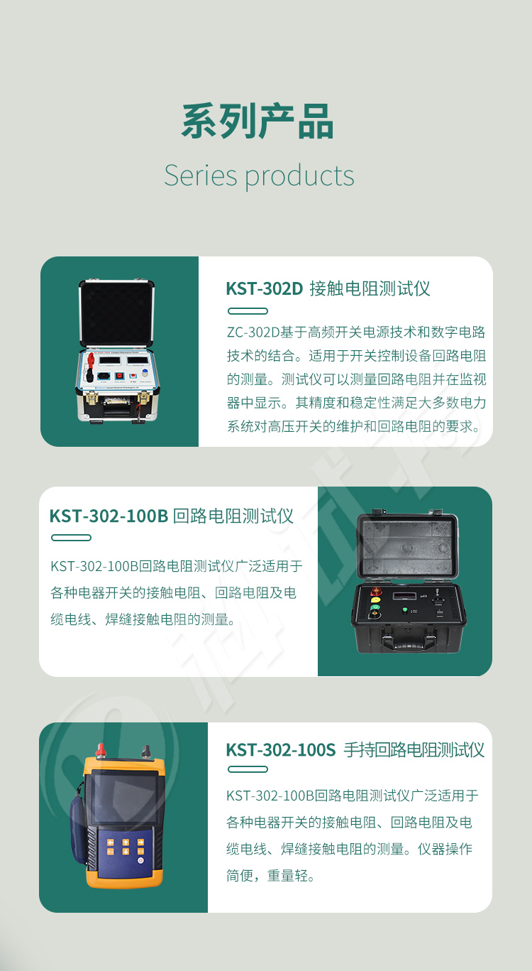 KST-302回路电阻测试仪是我公司为适应GB50150-2006和DL/T 845.4-2004规程要求开发的测试仪器,广泛适用于各种电器开关的接触电阻、回路电阻及电缆电线、焊缝接触电阻的测量。