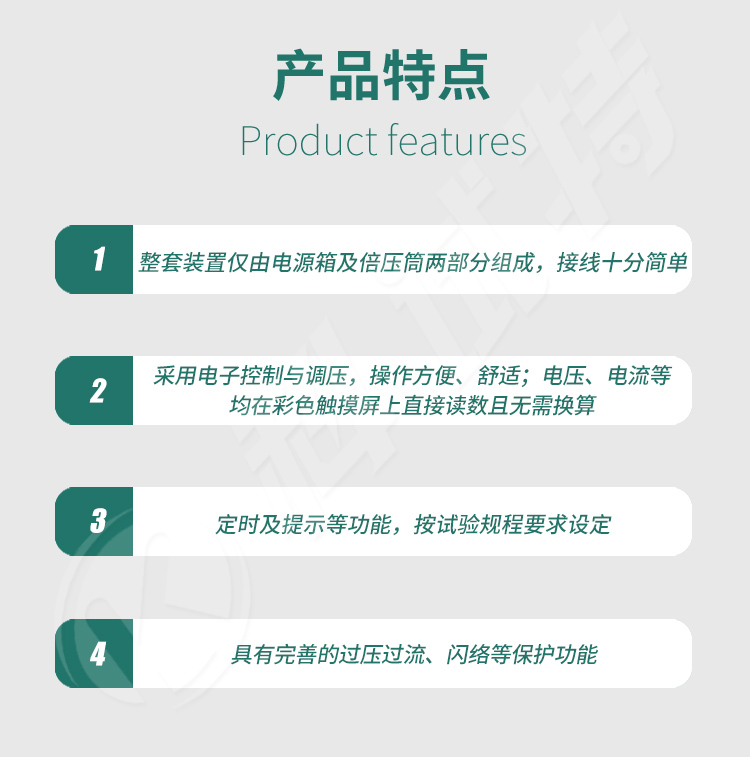 1、整套装置仅由电源箱及倍压筒两部分组成,接线十分简单。