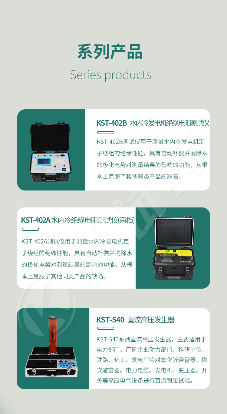 KST-541-80KV/200mA型水内冷发电机直流耐压测试仪是专为水内冷发电机进行泄漏电流和直流耐压试验使用的,它是根据“低压屏蔽法”原理研制开发的,采用了中频倍压电路,应用最新的PWM脉宽调制技术和大功率IGBT器件。并根据电磁兼容性理论,采用特殊屏蔽、隔离和接地等措施。