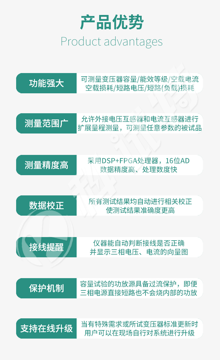 本产品具有体积小、重量轻、测量准确度高、稳定性好、操作简单等诸多优点。完全可以取代以往利用多表法测量变压器损耗和容量的方法,接线更简单,测试、记录更方便,使您的工作效率得到了大幅度的提升。