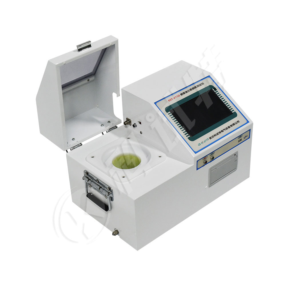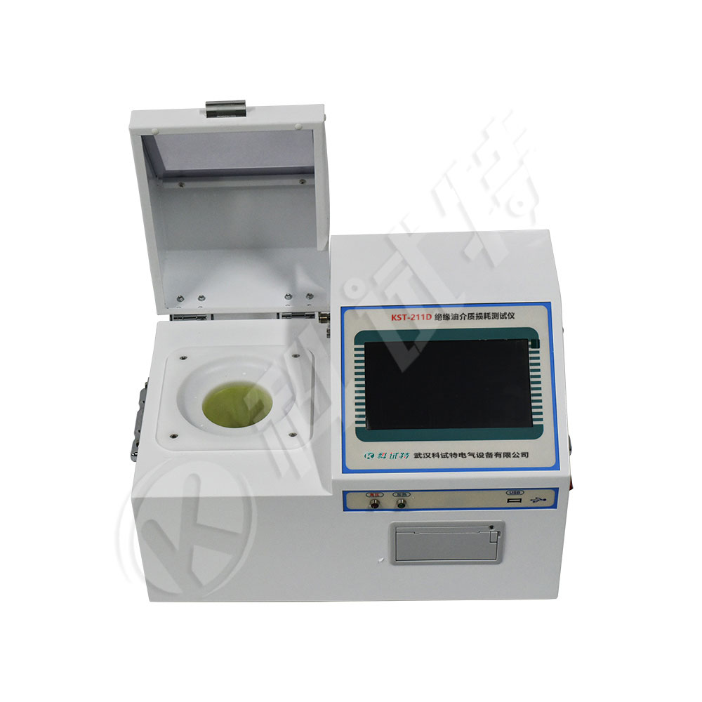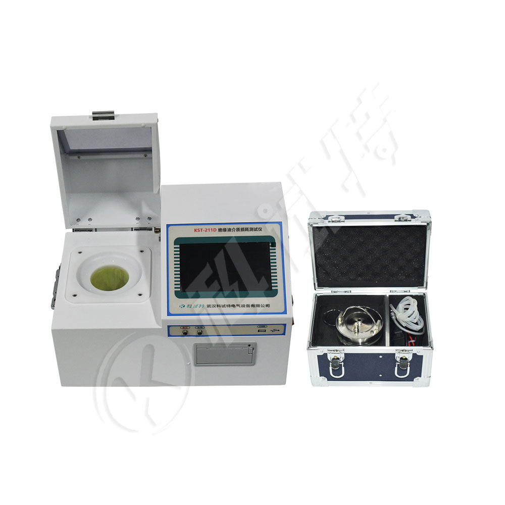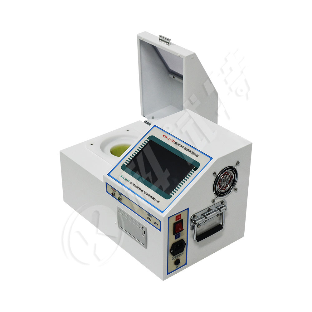 KST-211D测试仪用于绝缘油等液体绝缘介质的介质损耗角及体积电阻率测试的一体化结构的高精密仪器。内部集成了介损油杯、温控仪、温度传感器、介损测试电桥、交流试验电源、标准电容器、高阻计、直流高压源等主要部件。其中加热部分采用了当前最为先进的高频感应加热方式,该加热方式具备油杯与加热体非接触、加热均匀、速度快、控制方便等优点。内部标准电容器为SF6充气三极式电容,该电容的介损及电容量不受环境温度、湿度等影响,保证仪器长时间使用后仍然精度一致。
