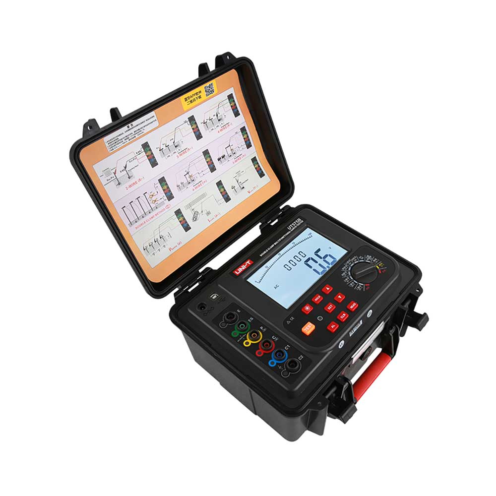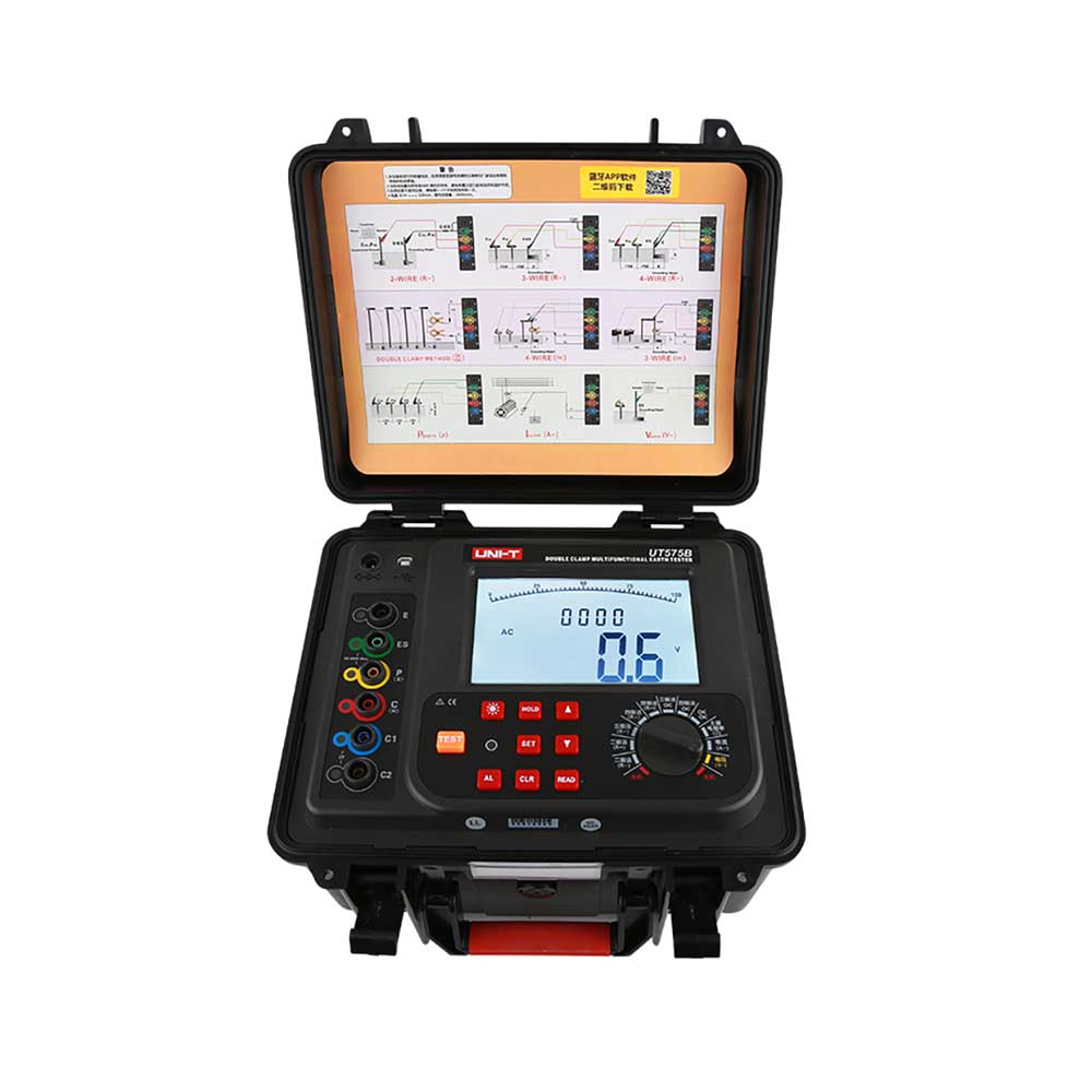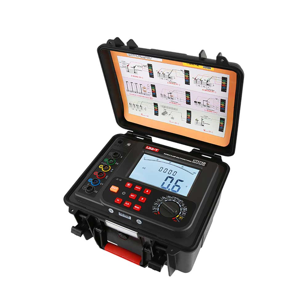 UT575B双钳多功能接地电阻测试仪是一款专为现场测量接地电阻、直流电阻、土壤电阻率、接地电流、接地电压而精心设计制造的高端仪表。仪表采用先进数宇处理技术,具有二线法、三线法、四线法、选择法、双钳法等各种测量方法选择,钳头采用大口径电流钳设计,可测量大尺寸接地引下线的接地电阻值,可灵活测量单点和网状接地等各种复杂接地结构的接地电阻值,测量并联接地系统时无需断开任何并联接地极,极大地望高了测量的方便性,为接地性能测试提供了完美的解决方案,仪表具有存储功能、时钟功能,自动存储含有日期时间的测试结果2000组。并支持安卓系统的蓝牙通讯动能及USB接口,存储数据通过USB接口上传PC机,可以实现历史记录数据读取、查阅、保存、报表、打印等功能,仪表广泛应用于电力、电信、气象、油田、建筑、防雷及工业电气设备等行业。
