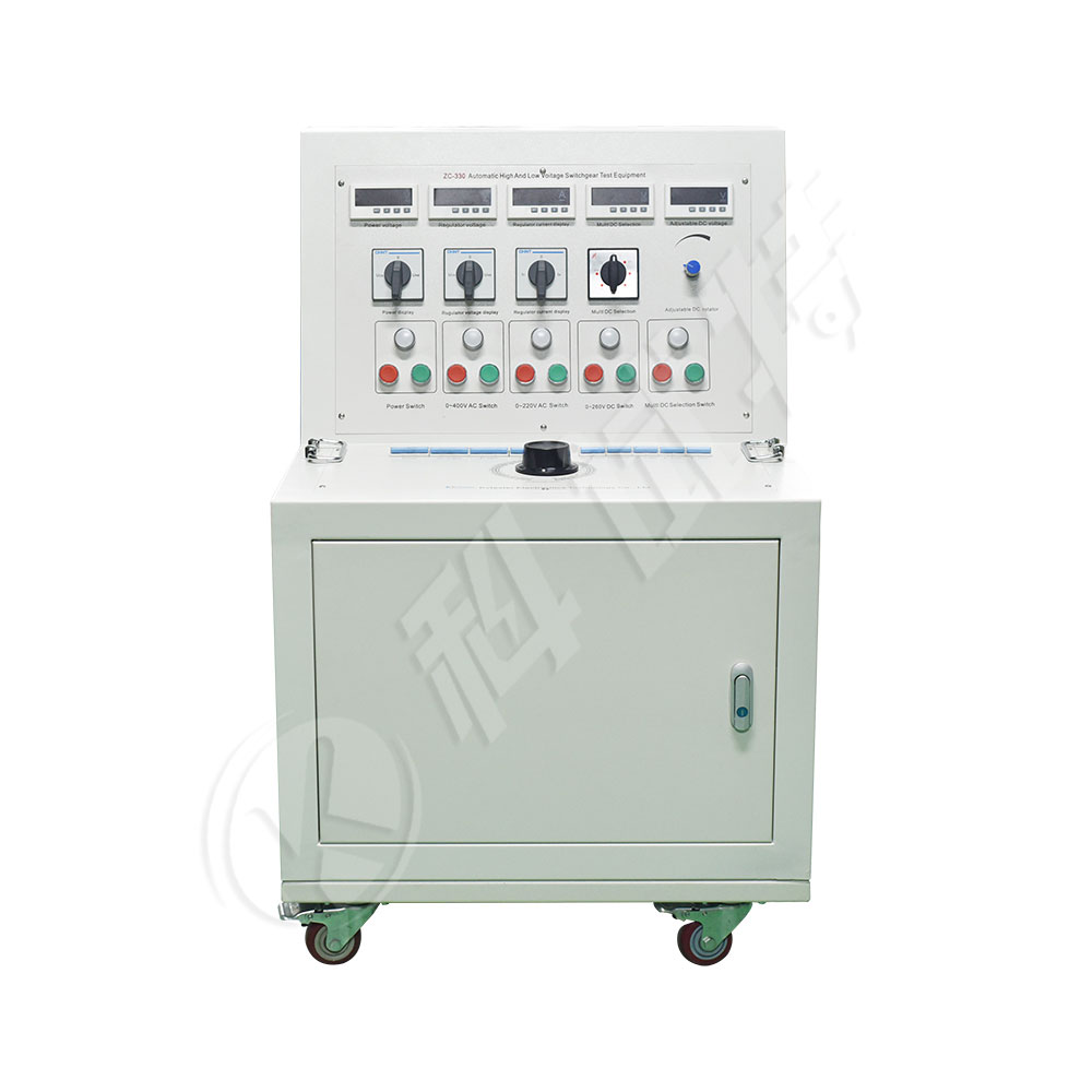 KST-330高低压开关柜通电试验台用于高低压开关柜生产厂家对所生产的高低压开关柜进行出厂前的各项通电试验。高低压开关柜通电试验台能提供各种交、直流电源,便于对开关柜的检测,提高工作效率。