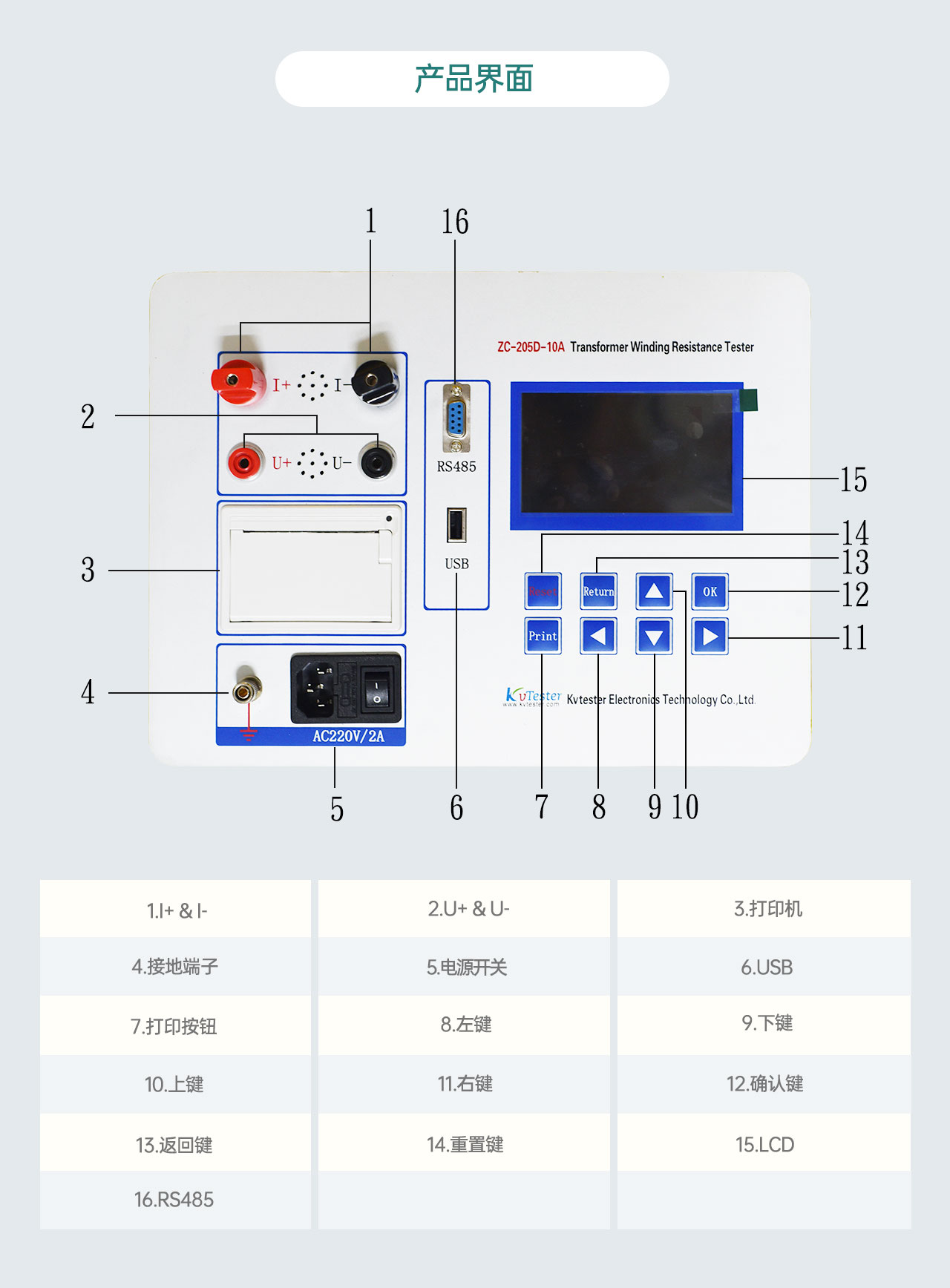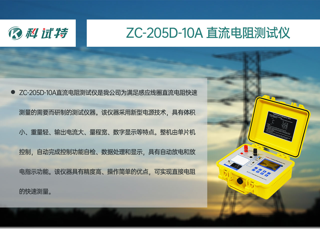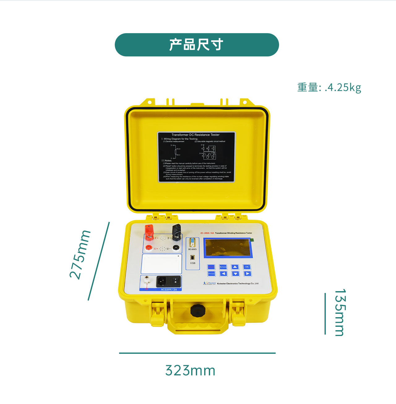 KST-205D-10A直流电阻测试仪是我公司为满足感应线圈直流电阻快速测量的需要而研制的测试仪器。该仪器采用新型电源技术,具有体积小、重量轻、输出电流大、量程宽、数字显示等特点。整机由单片机控制,自动完成控制功能自检、数据处理和显示,具有自动放电和放电指示功能。该仪器具有精度高、操作简单的优点,可实现直接电阻的快速测量。
