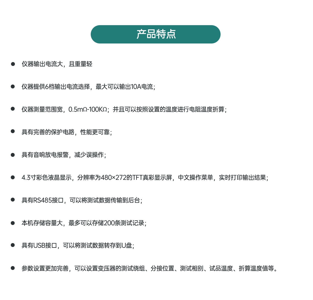 3、仪器测量范围宽,0.5mΩ-100KΩ;并且可以按照设置的温度进行电阻温度折算;