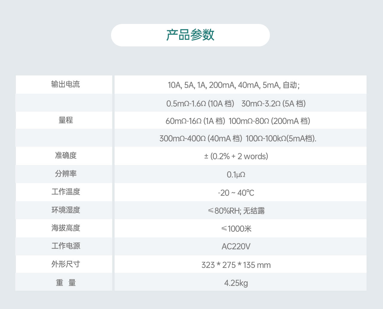 | 量程 | 0.5mΩ~1.6Ω (10A档) 30 mΩ~3.2Ω (5A档) 60 mΩ~16Ω (1A档) 100 mΩ~80Ω (200mA档) 300 mΩ~400Ω (40mA档) 100Ω~100kΩ (5mA档) |
