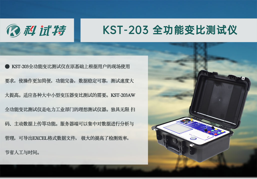 根据IEC及国家有关标准规定,在电力变压器生产 、用户交接和检修试验过程中,变压器变比试验是必做的项目,这样可有效监督变压器产品出厂及使用过程中的质量,防止变压器匝间短路,开路,连接错误,调压开关内部故障或接触故障。为此我公司研制生产的KST-203AW全功能变比测试仪在原基础上根据用户的现场使用要求,使操作更加简便,功能完备,数据稳定可靠,测试速度大大提高。适应各种大中小型变压器变比测试的需要。KST-203AW全功能变比测试仪是电力工业部门的理想测试仪器。独具无限 扫码、主动数据上传等功能。服务器端可以集中对数据进行分析与管理,可导出EXCEL格式数据文件, 极大的提高了检测效率,节省人工与时间。