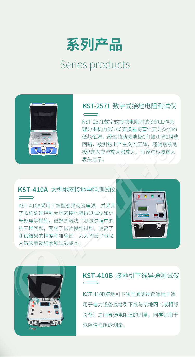 KST-411适用于测量各种电信、电力、气象、机房、油田、电力配电线路、铁塔输电线路、加油站、工厂接地网、避雷针等接地电阻。仪表电流电阻同屏显示、量程宽广,分辨率高,测试结果准确、可靠、性能稳定,抗干扰能力强,由微处理器控制,可准确检测接地电阻,同时数据存储和数据上传等功能。