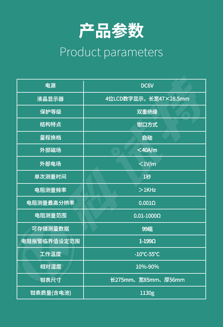 | 产品型号 | 钳口尺寸 | 电阻量程 | 电流量程 | 数据上 传功能 | 报警 功能 | 数据 存储 | 备注 |